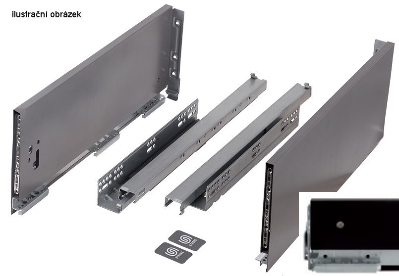 StrongMax = celovýsuv s tlumením a úzkou dutou bočnicí- hloubka 450mm- výška 121mm- nosnost do 40kg- barva černá- synchronizovaný výsuv, možnost seřízení náklonu celé zásuvky v zadní části (slouží k seřízení náklonu čela)- maximální doporučená šířka zásuvky je 1,6 násobek délky výsuvu ( pro širší zásuvky doporučeno použít podpěru dna viz související produkty)- pro tloušťku dna a zad 16mm - životnost výsuvu minimálně 50 tis. cyklů- doporučené dekory lamina: DTDL 162 PE Šedá grafitováSada obsahuje- bočnice L+P- výsuv L+P- držák zad L+P- držák čela 2x- krytka s logem Strong 2x- vruty pro příchyt čelaPozor dřevěné čelo, dno a záda zásuvky nejsou součástí- rozměry přířezů viz obrázek číslo 2Volitelné komponenty k dokoupení (související produkty) Zásuvka se zvýšenými bočnicemi bez vnitřního dělení = 1x sada relingů, 1x zvýšená bočnice bez perforaceZásuvka se zvýšenými bočnicemi + vnitřní dělení = 1x sada relingů, 1x zvýšená bočnice s perforací, vnitřní dělení zásuvky se zvýšenými bočnicemi dle uváženíZásuvka s relingem pro navýšení zásuvky + vnitřní dělení = 1x reling, vnitřní dělení zásuvky s relingem dle uváženíVnitřní zásuvka = 1x držák čelního profilu, 1x čelní profil, 1x úchytkový profilVnitřní zásuvka se skleněným čelem = 1x držák skleněného čela, 1x alu profil pro čelo se sklem, 1x čelní skloJednoduchá montáž = Strong označovací šablona, šablona pro montáž čela