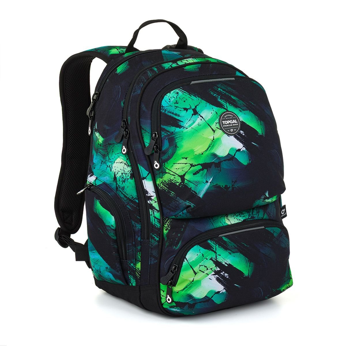 Dvoukomorový batoh s moderním abstraktním motivem v sytých odstínech neonově zelené a hluboké černé. Záda batohu jsou polstrovaná a anatomicky tvarovaná z měkké pěny. Uvnitř zadní komory je umístěna polstrovaná kapsa na notebook i tablet. Kromě dvou hlavních komor má batoh dvě přední kapsy, do kterých se krásně vejde ETUE 26042 ve stejném designu nebo svačinový box. Do prostřední komory jsme umístili síťovanou kapsu na doklady a karabinu na klíče. Postranní kapsy na lahev jsou vyrobeny ze stejného materiálu jako batoh (perfektně udrží 1,5 litrovou láhev) a reflexní prvky nenarušují celkový vzhled batohu. Hlavní charakteristika: váží 1,24 kg dvě komory, dvě přední kapsy pevná lisovaná záda z měkké pěny poutka pro bederní pás TOP 24021 a TOP 24022 pevné dno z materiálu TOPDURA polstrované ramenní popruhy měkká kapsa na notebook zátěr proti dešti reflexní prvky