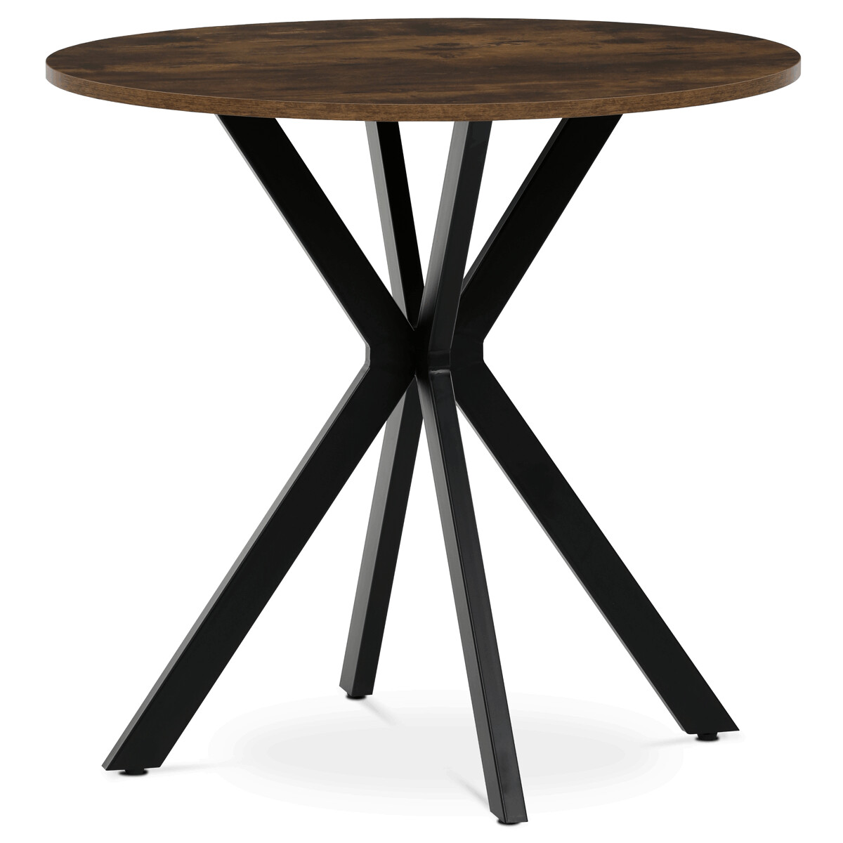 Jídelní kulatý stůl HT-F4108 OLW značky Autronic vyniká kombinací přírodní MDF desky s dekorem starého dřeva a pevné konstrukce z černě lakovaného kovu. Deska o průměru 80 cm a výšce 75 cm je opatřena ABS hranou, která chrání okraje před poškozením a zvyšuje odolnost proti opotřebení. Kovová podnož je tvořena čtyřmi zkříženými nohami, které zajišťují stabilitu a zároveň dodávají moderní industriální vzhled. Rektifikační nohy umožňují vyrovnání stolu na nerovném povrchu, což přispívá k jeho praktičnosti a komfortu při používání. Povrch desky s dekorem old wood přináší autentický přírodní vzhled, který se hodí do různých interiérů od rustikálních po moderní. Celková konstrukce stolu je navržena tak, aby poskytovala dostatek prostoru pro pohodlné stolování a zároveň byla snadno udržovatelná. Stůl je ideální volbou pro menší jídelny či kuchyňské kouty, kde oceníte kombinaci estetické hodnoty a funkčnosti.