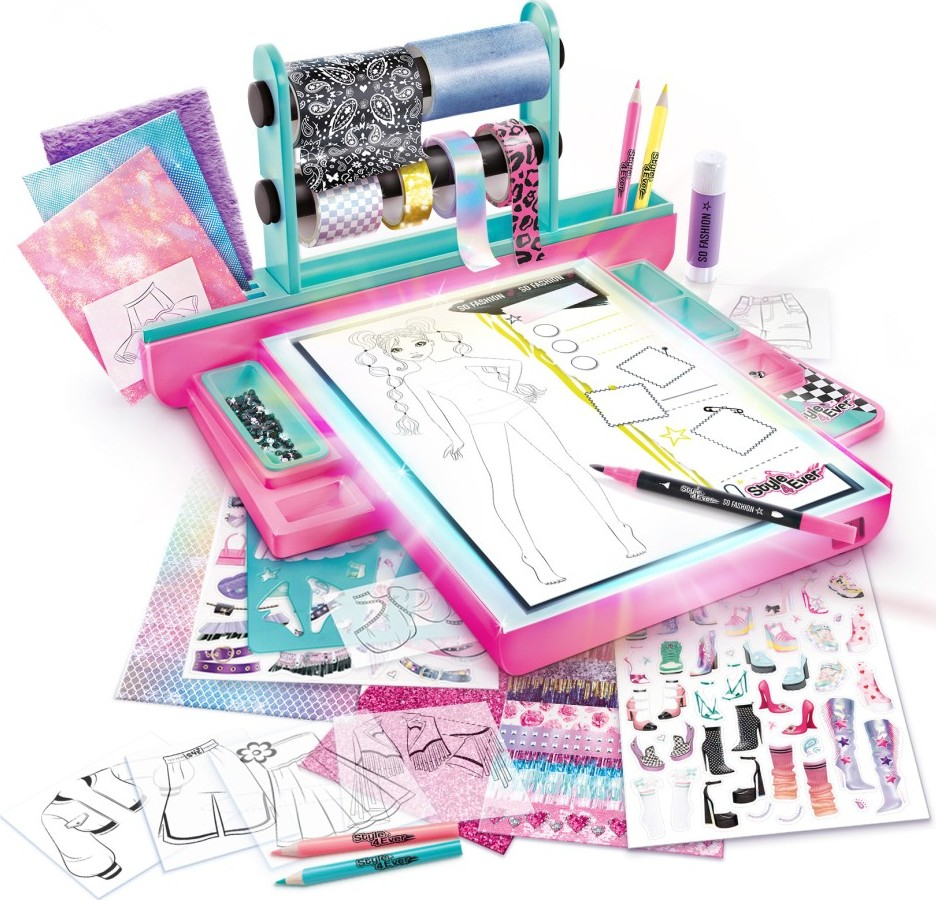 Novinka Style4Ever Návrhářské módní studio Light-up s podsvícenou podložkou vám přinese hodiny tvořivé zábavy. Splňte si sen a vytvořte návrhy jako módní návrhář. V balení naleznete: návrhářské módní studio včetně podsvícené položky 20 modelů 1 oboustranný fix sáček s 25 kamínky lepidlo 4 barevné tužky 6 potištěných roliček 12 potištěných archů 3 samolepící archy látek 2 archy šablon 3 archy obrysových šablon 2 archy nálepek Výrobek vyžaduje 3× AAA 1,5V baterie (nejsou součástí). Vhodné pro děti od 6ti let.