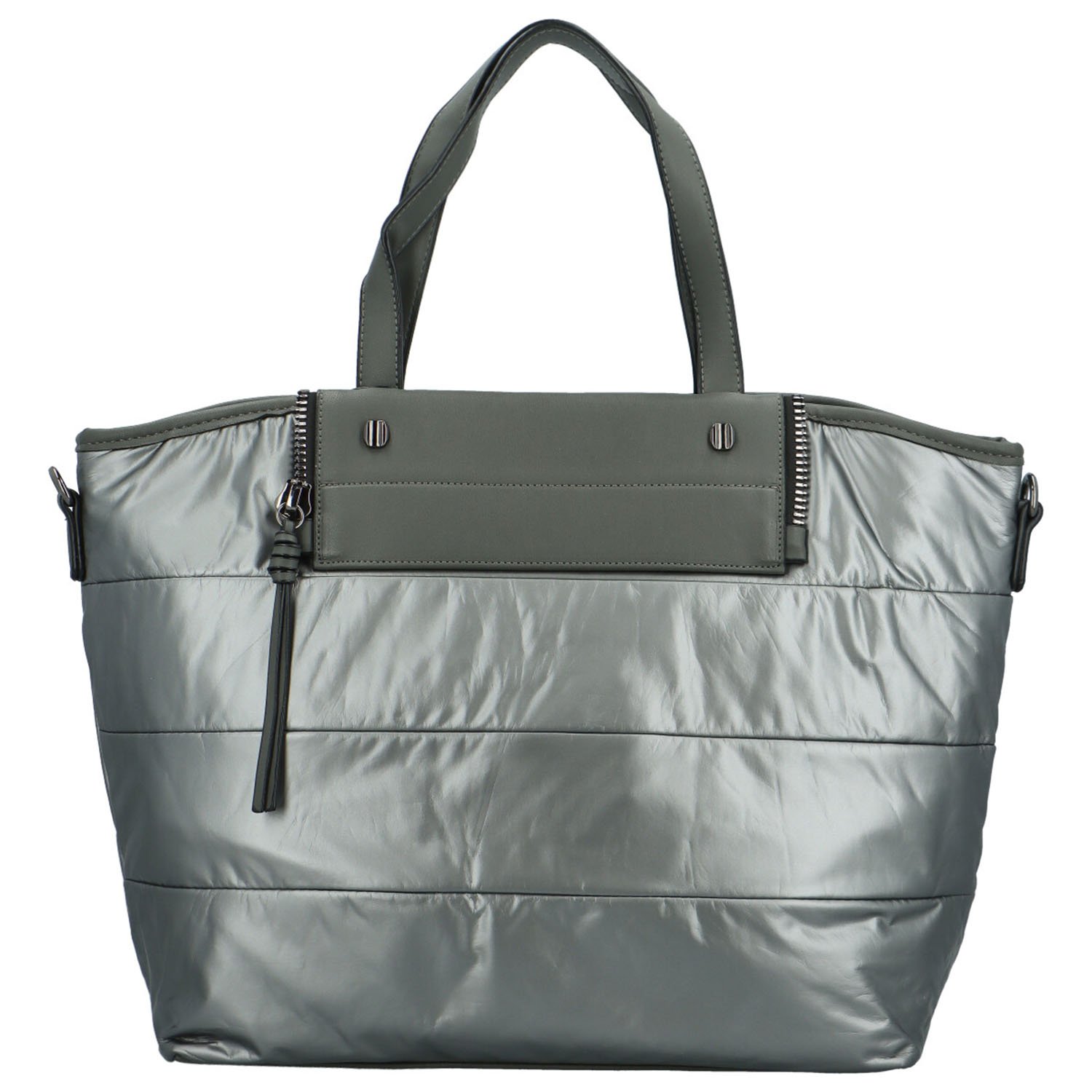 Kabelka je větší, ušitá z příjemného polyesteru, který je lehký a voděodolný. Doplňky v podobě okrasné klopy se stříbrným zipem jsou koženkové. Společně s uchy a přídavným popruhem, který je také ze syntetické kůže a tak se skvěle nosí v ruce i na rameni.
