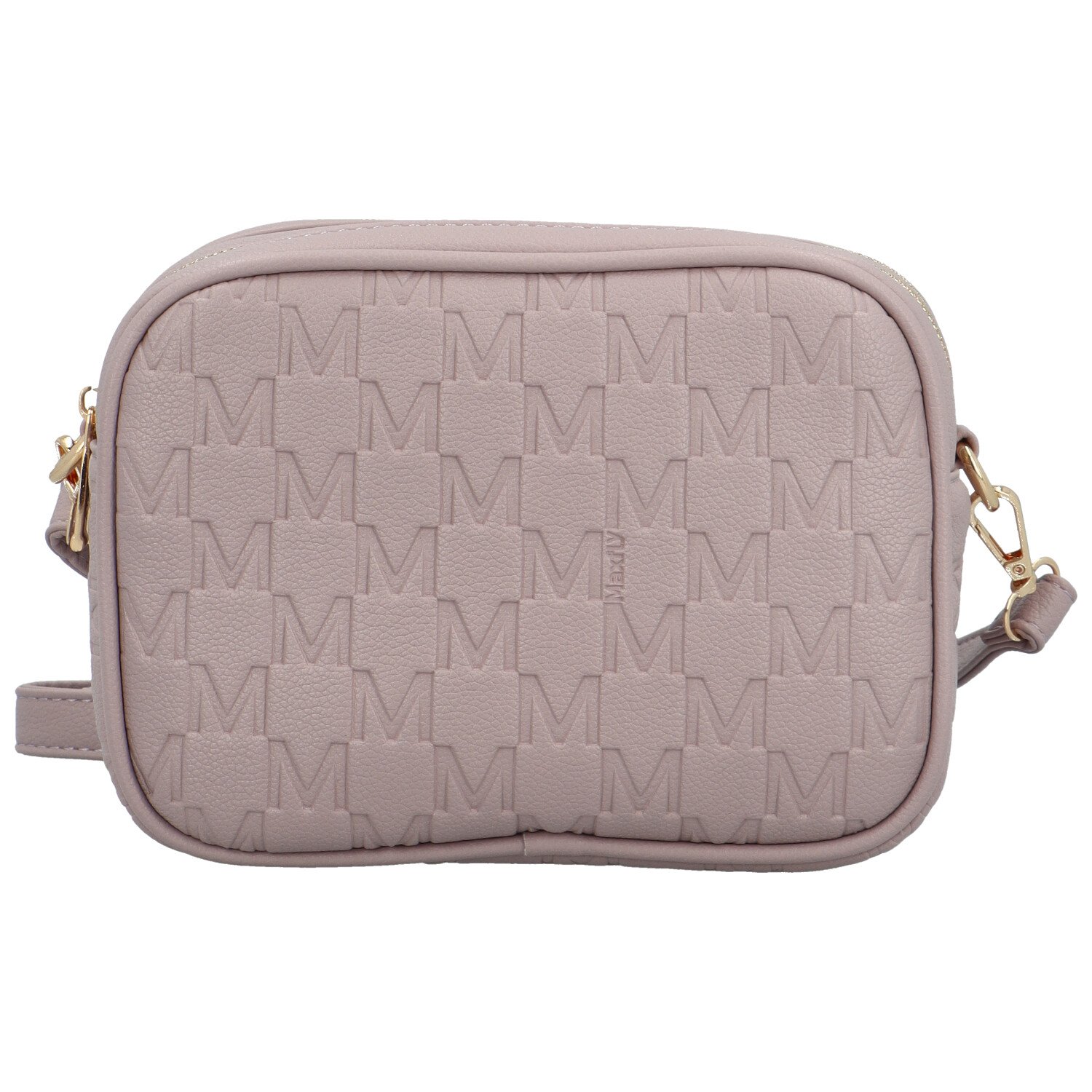 Crossbody má obdélníkový, kompaktní a pevný tvar. Koženkový materiál má jemně zrnitou strukturu s vyraženým vzorem složeným z opakujících se písmen 'M'. Má dvě samostatné kapsy na zip ve zlaté barvě.