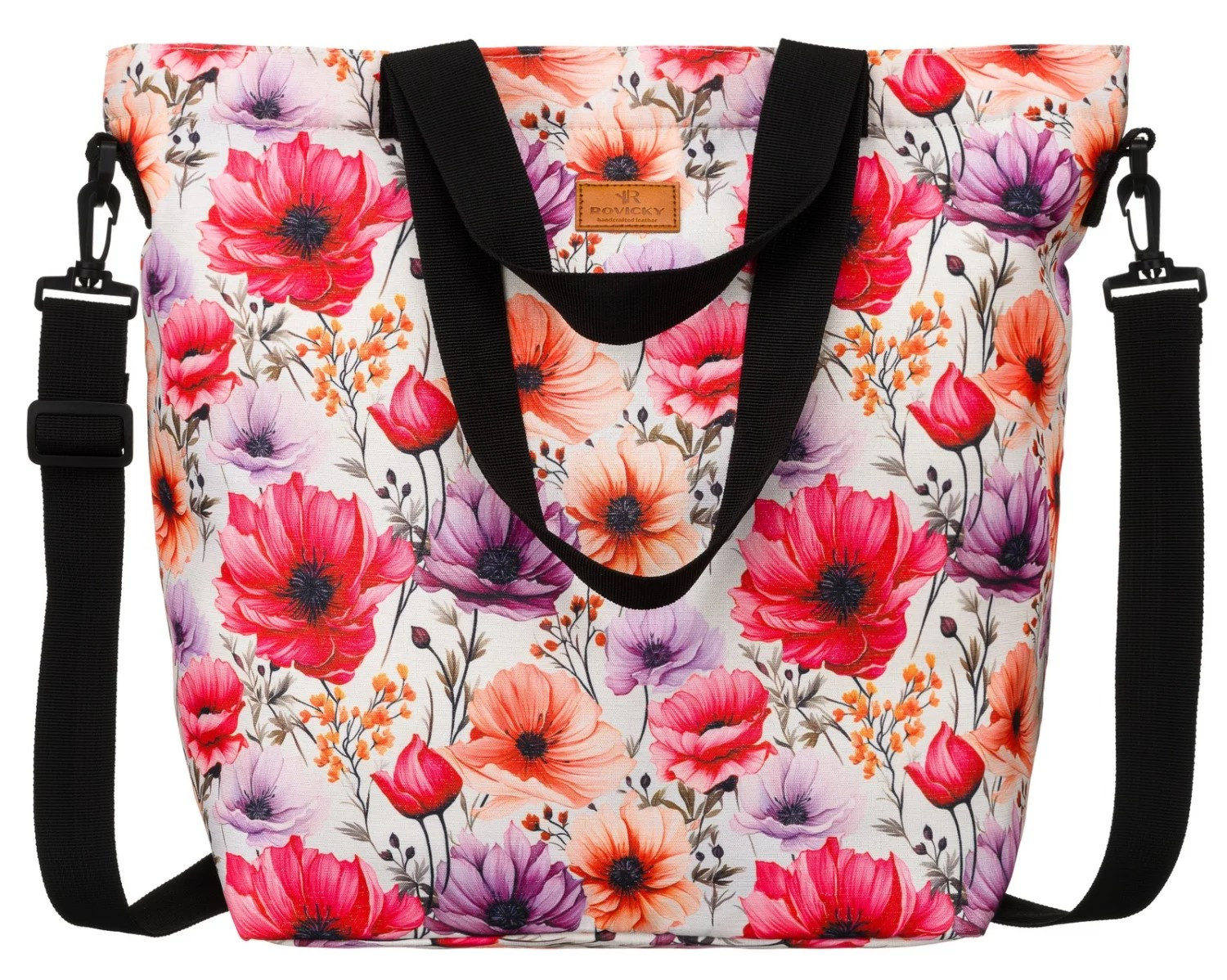 Tato prostorná dámská taška zaujme na první pohled svým veselým, květinovým designem. Barevné květy dodávají tašce svěží a letní vzhled. Má praktické uzavírání na zip a černé látkové uši, které umožňují dvojí nošení, jak v ruce, tak na rameni.
