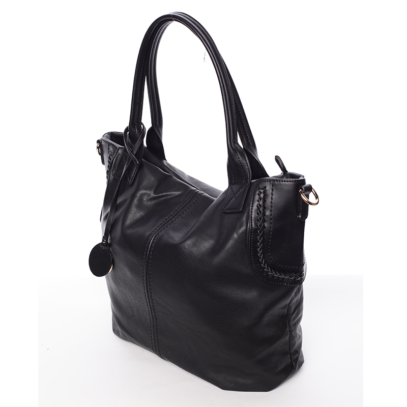 Krásná černá módní kabelka přes rameno s nastavitelným popruhem. Kabelka je měkká s pevným dnem, uvnitř prakticky rozdělena přepážkou na zip. Uvnitř má další kapsičky na drobnosti. Tato kabelka se hodí pro každodenní nošení do práce, do školy, či za zábavou. Novinka 2017!