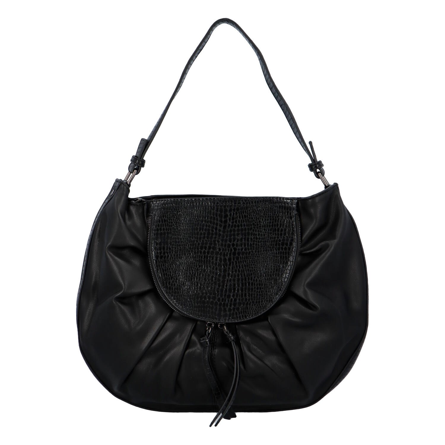 Módní dámská koženková kabelka, která bude skvělá na rameni i v ruce. Nabízí hlavní kapsu na zip, pro uložení vašich důležitých věcí. Přední i zadní díl zdobí zajímavá aplikace a v ní kapsa na zip. Ucho je pevné do ruky, popruh na připnutí.