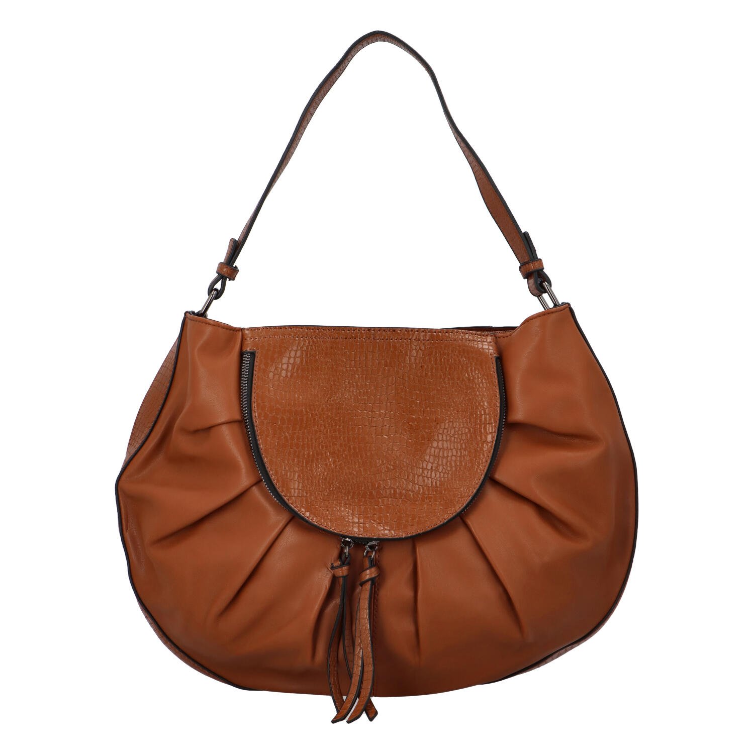 Módní dámská koženková kabelka, která bude skvělá na rameni i v ruce. Nabízí hlavní kapsu na zip, pro uložení vašich důležitých věcí. Přední i zadní díl zdobí zajímavá aplikace a v ní kapsa na zip. Ucho je pevné do ruky, popruh na připnutí.