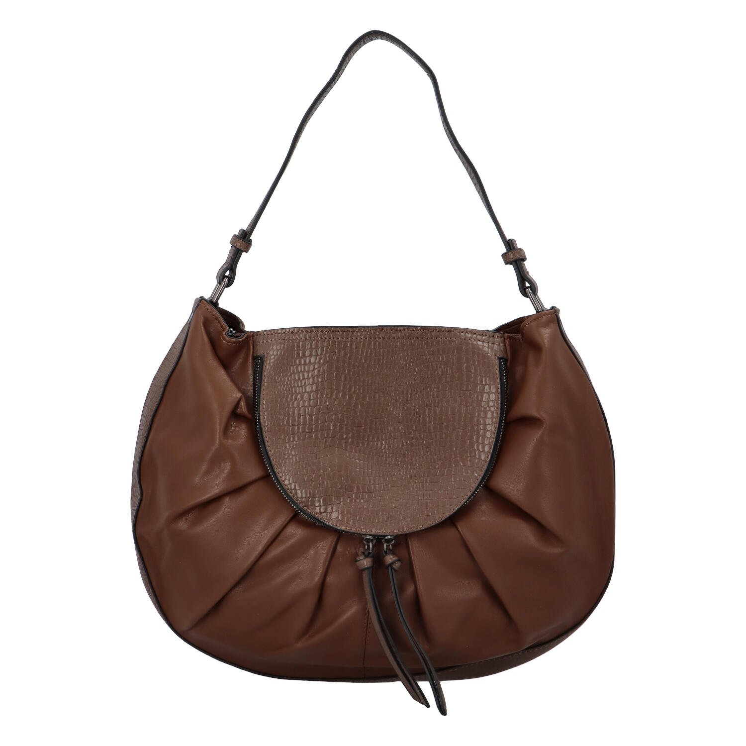 Módní dámská koženková kabelka, která bude skvělá na rameni i v ruce. Nabízí hlavní kapsu na zip, pro uložení vašich důležitých věcí. Přední i zadní díl zdobí zajímavá aplikace a v ní kapsa na zip. Ucho je pevné do ruky, popruh na připnutí.