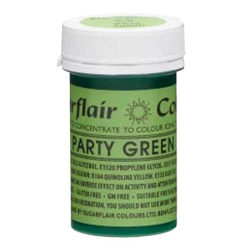 Sugarflair Gelová barva potravinářská Plesově zelená (party green) 25g Gelová barva koncentrovaná. Není potřeba ředit vodou. Používá se k barvení potahovacích hmot, krémů, polev, těst. Stačí nanést malé množství gelu za pomocí párátka, špičky nože, špičky lžičky. Pro intenzivnější odstín přidat více gelu dle potřeby. Pro malování na potahovacích hmotách rozředit gelovou barvu s mírným množstvím bezbarvého alkoholu. Použití a dávkování - řídí se platnými hygienickými předpisy a příslušnými technickými normami, především vyhláškou Ministerstva zdravotnictví č.298/97 Sb. Pro barvení cukrářských výrobků je stanovené maximální množství barviva do 200 mg/kg výrobku – pro jedlé ozdoby na cukrářské výrobky. Pro použití barviv v kombinaci je celková nejvyšší povolená hodnota barviv stanovená na 500 mg/kg a týká se celkového množství použitých barviv (cca 1 čajová lžička na 1 kg). Upozornění – vhodnost použití, stabilita a dávkování musí být odzkoušeny výrobcem finálního produktu. Složení – glycerin, propylenglykol, E551, barvivo (dle skutečnosti na originálním balení E102,E122,E133,E110,E129,E133,E155). Neobsahuje tuk, ořechy, lepek. Barviva E102,E104,E110,E122,E124,E129 mohou nepříznivě ovlivňovat činnost a pozornost dětí.