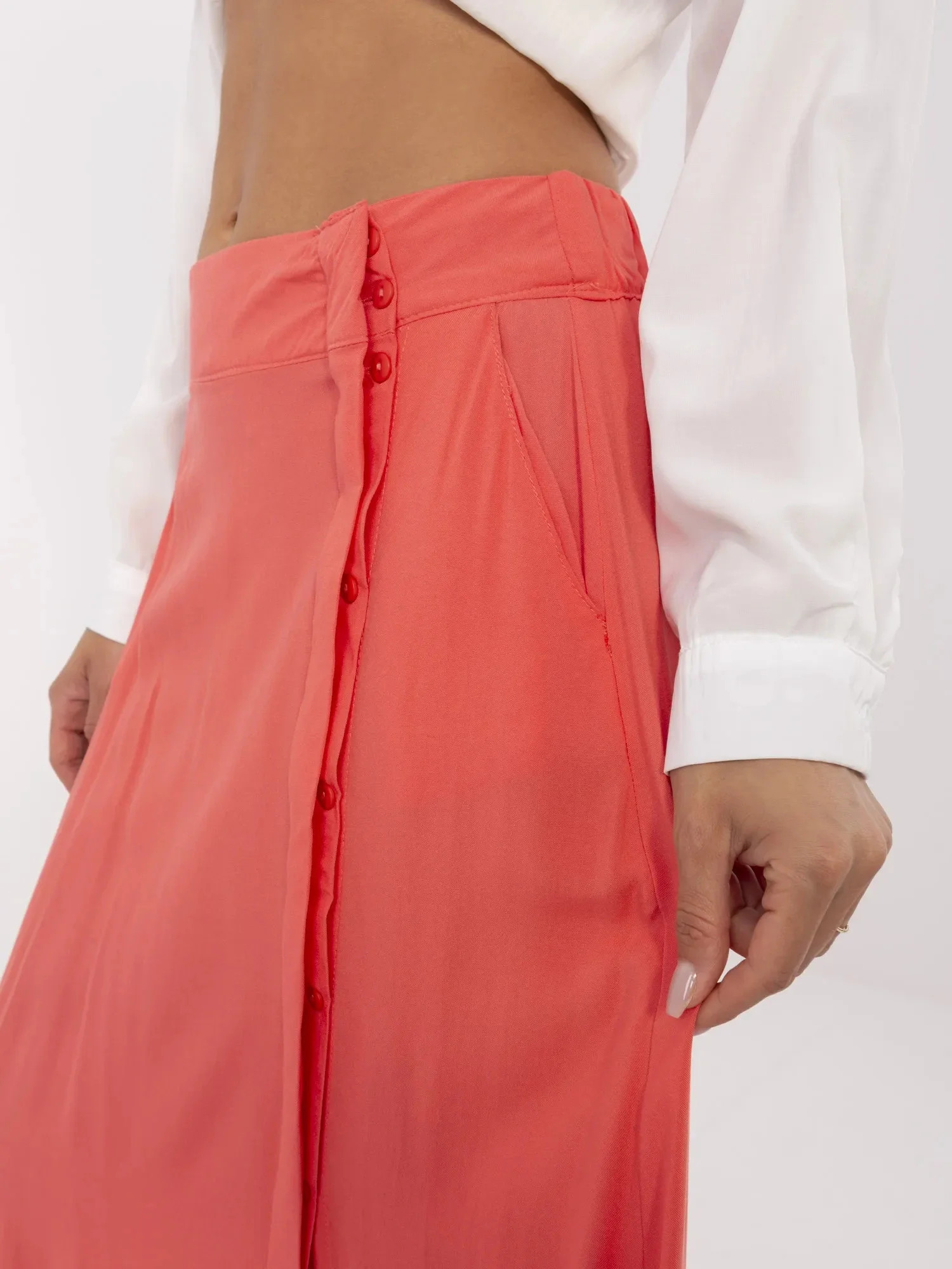 Dámská dlouhá sukně s kapsami, se zapínáním po celé délce na knoflíky. Vysoký rozparek. V pase na gumu. Materiálové složení: 100% Viskóza Modelka má na sobě velikost S. Rozměry modelky: výška 173 cm, prsa 85 cm, pas 62 cm, boky 95 cm. Rozměry sukně velikosti S měřené na plocho: šířka v pase - 37 cm (na plocho), šířka v pase - 47 cm (při natažení), šířka v bocích - 55 cm, celková délka - 86 cm. Mezinárodní velikost Výška Obvod pasu XS 34 156-164 66-74 S 36 160-168 72-80 M 38 162-172 78-86 L 40 164-174 84-90 XL 42 166-178 88-96