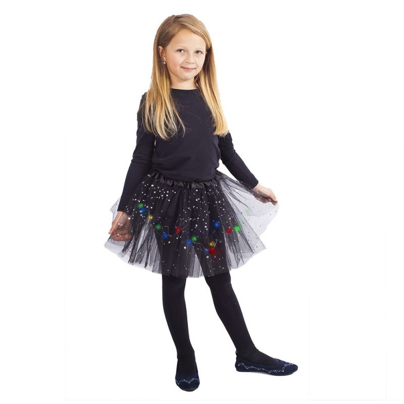 Sukně tatu svítící - černá Úchvatná sukně tutu pro všechny malé parádnice! Sukýnka černé barvy je určena pro holčičky ve věkovém rozmezí 3-10 let (104-146 cm). Nadýchaná tylová suknička je zdobena saténovou gumou a zdobena flitry, součástí jsou barevná světýlka, která po zapnutí blikají. Baterie jsou součástí. Délka sukně cca 32 cm.