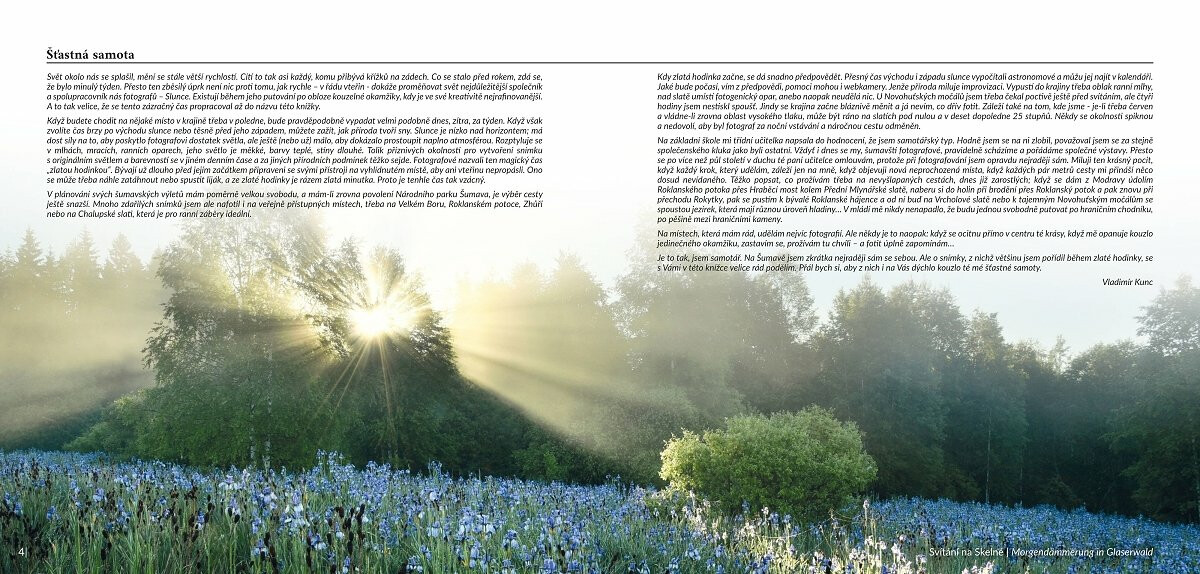 Dovolujeme si Vám představit nejnovější knihu Vladimíra Kunce ŠUMAVA Zlatá hodinka.Autor se po letech s fotoaparátem vrací na milovanou Šumavu s touhou zachytit její krásy v lichotivém světle, fotografy tolik milované, „zlaté hodinky“...Vydejte se tedy spolu s ním za touto magickou a prchavou chvilkou, kdy svět stojí na rozhraní a ponořte se do měkkých paprsků rodícího se či odcházejícího dne..Výňatek z úvodního textu autora:„Kdy zlatá hodinka začne, se dá snadno předpovědět. Přesný čas východu i západu slunce vypočítali astronomové a můžu jej najít v kalendáři. Jaké bude počasí, vím z předpovědi, pomoci mohou i webkamery. Jenže příroda miluje improvizaci. Vypustí do krajiny třeba oblak ranní mlhy, nad slatě umístí fotogenický opar, anebo naopak neudělá nic. U Novohuťských močálů jsem třeba čekal poctivě ještě před svítáním, ale čtyři hodiny jsem nestiskl spoušť. Jindy se krajina začne bláznivě měnit a já nevím, co dřív fotit. Záleží také na tom, kde jsme - je-li třeba červen a vládne-li zrovna oblast vysokého tlaku, může být ráno na slatích pod nulou a v deset dopoledne 25 stupňů. Někdy se okolnosti spiknou a nedovolí, aby byl fotograf za noční vstávání a náročnou cestu odměněn.Je to tak, jsem samotář. Na Šumavě jsem zkrátka nejraději sám se sebou. Ale o snímky, z nichž většinu jsem pořídil během zlaté hodinky, se s Vámi v této knížce velice rád podělím. Přál bych si, aby z nich i na Vás dýchlo kouzlo té mé šťastné samoty…“