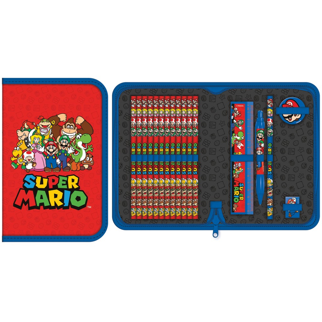 Super Mario penál naplněný Tento produkt je tematicky zaměřený na populární postavy z herní série Super Mario, což je patrné z výrazného barevného designu na přední straně penálu. Obal je červený s modrým lemováním a zdobí ho skupina hlavních postav, jako jsou Mario, Luigi, Princezna Peach, Donkey Kong, Yoshi a další. Nápis „Super Mario“ je výrazný a barevný, což zdůrazňuje herní téma produktu. Penál má tvar obdélníku, který je praktický pro uložení školních potřeb a snadno se zipem otevírá a zavírá. Uvnitř penálu je pečlivě uspořádaná sada školních potřeb, které jsou rovněž zdobeny motivy Super Maria. Najdete zde deset tužek s potiskem různých postav, což poskytuje dostatek zásob pro psaní či kreslení. Dále je zde pravítko, pero, zvýrazňovač, guma a ořezávátko – všechny tyto předměty nesou jednotný grafický design s postavami ze světa Super Mario. Interiér penálu je černý s jemnými vzory motivů z hry, což dodává celkovému vzhledu jednotnost a zvýrazňuje herní téma. Penál je tedy nejen esteticky atraktivní pro děti i fanoušky této herní série, ale také prakticky vybavený pro školní nebo kreativní potřeby. Díky kompletnímu naplnění a kvalitnímu zpracování je vhodný jako dárek nebo doplněk školních pomůcek. Celkově produkt spojuje funkčnost s oblíbenou licencí, což jej činí zajímavým a originálním školním doplňkem.