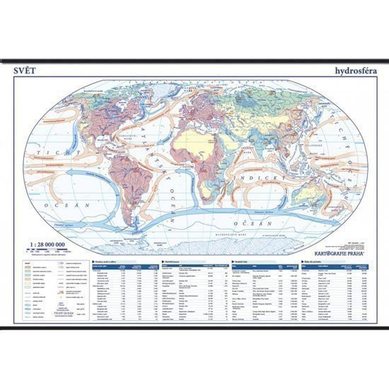 Mapa hydrosféry světa nejen do hodin zeměpisu. Mapa světové hydrosféry přehledně zobrazuje nejdůležitější vodní toky a plochy světa, vymezuje hlavní světová úmoří a zobrazuje směr a charakter mořských proudů. Tyto základní údaje doplňují informace o slanosti moří a oceánů, místech vysokého přílivu a průměrných a maximálních průtocích hlavních vodních toků a maximálních průtocích hlavních vodních toků. Mapa je dodávaná s dřevěnými lištami a 20 kusy příručních map, pro práci žáků v lavicích. Formát: 1 360 × 960 mm Vazba: laminovaná mapa s dřevěnými lištami Vydání: 2006 (1. vydání) Měřítko: 1 : 28 000 000