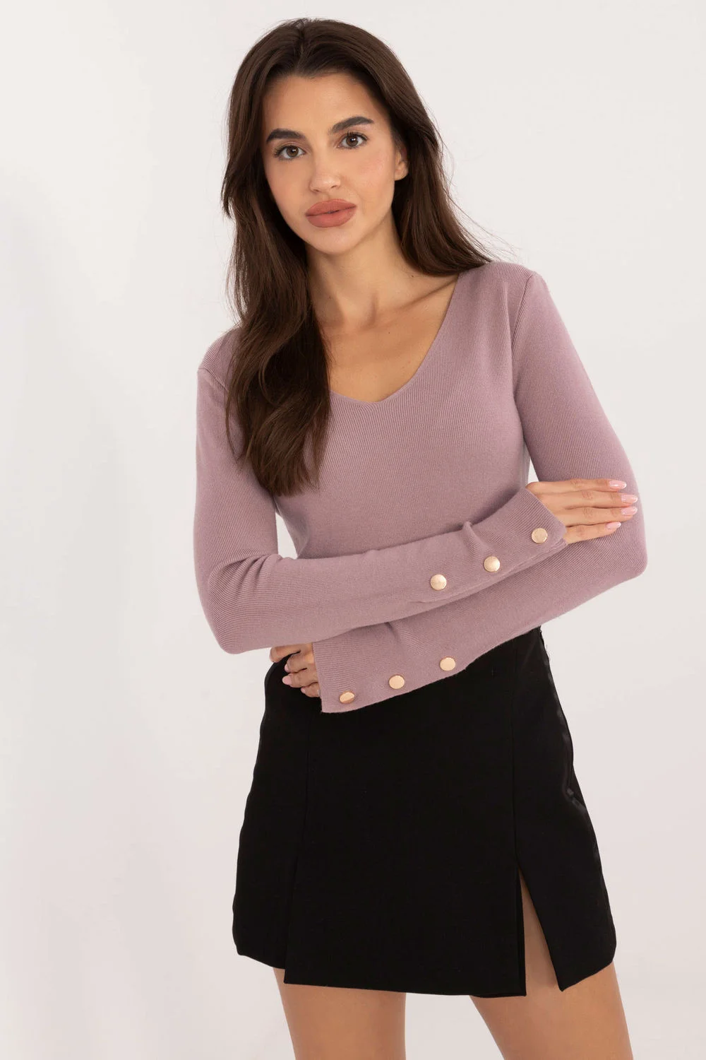 Dámský volný svetr ideální na každodenní nošení i do práce. Vyrobený z vysoké kvality směsi materiálů: viskózy, polyamidu a polyesteru, který zaručuje pohodlí a odolnost. Hladký vzor a klasická délka dělají z tohoto svetru univerzální kousek oblečení. Svetr má dlouhý rukáv zakončený ozdobnými knoflíčky na zápěstích, které dodávají jemný elegantní akcent. Výstřih ve tvaru písmene V zdůrazňuje krk a dodává celku ženský nádech. Skvělá volba jak do kanceláře, tak na každodenní nošení. Polyamid 22 % Polyester 29 % Viskóza 49 % Velikost Vnitřní délka rukávu Vnější délka rukávu Obvod prsou L/XL53-55 cm63-65 cm91-96 cmS/M49-51 cm59-61 cm82-86 cm