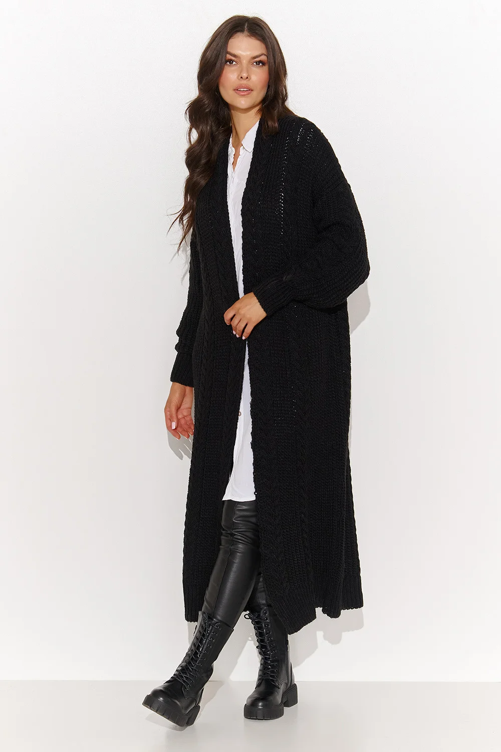 Tento dlouhý dámský svetr je naprostou nezbytností pro chladnější dny. Jeho otevřený střih a široké rukávy zakončené žebrovanými manžetami zajišťují pohodlí a volnost pohybu. Jemná kostkovaná vazba mu dodává na půvabu a jedinečnosti, takže je ideální volbou pro ženy, které ocení originální a elegantní detaily. Nepochybně se stane vaším oblíbeným kouskem šatníku během chladnějších dnů. Svetr se dodává v několika atraktivních barvách: cappuccino, černá, medová, nude a ocelová. Oblečte si ho k džínám a kozačkám a získejte ležérní, ale stylový každodenní vzhled. Nebo ho kombinujte s elegantními kalhotami a jehlovými podpatky pro formálnější příležitosti. Ať už ji budete nosit jakkoli, určitě si ji zamilujete! Akryl 85 % Polyamid 15 % Velikost DélkaObvod prsou Obvod v pase universal114 cm120 cm108 cm