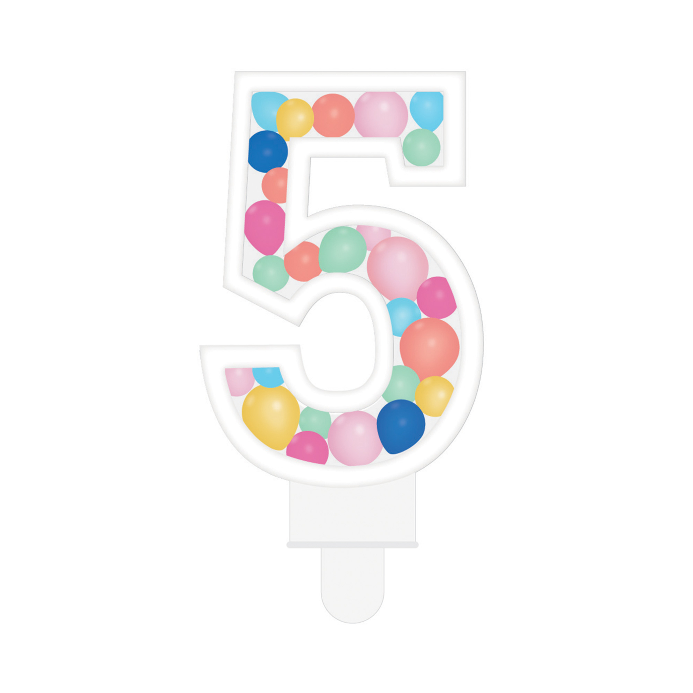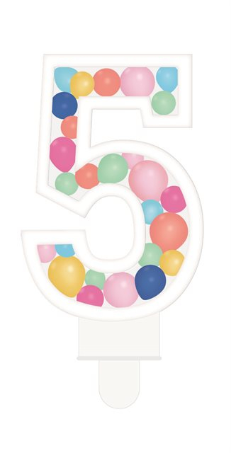 Originální dortová svíčka ve tvaru bílé číslice 5 plná barevných lentilek vesele dozdobí dort na narozeninovou oslavu či párty. Výška svíčky: 7,5 cm (8,8 cm včetně plastového zápichu) Obsah balení: 1 ks bílé svíčky s lentilkami