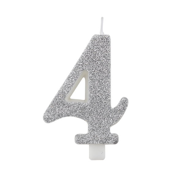 Svíčka číslo 4 stříbrná s glitrem Svíčka číslo 4 stříbrná s glitrem