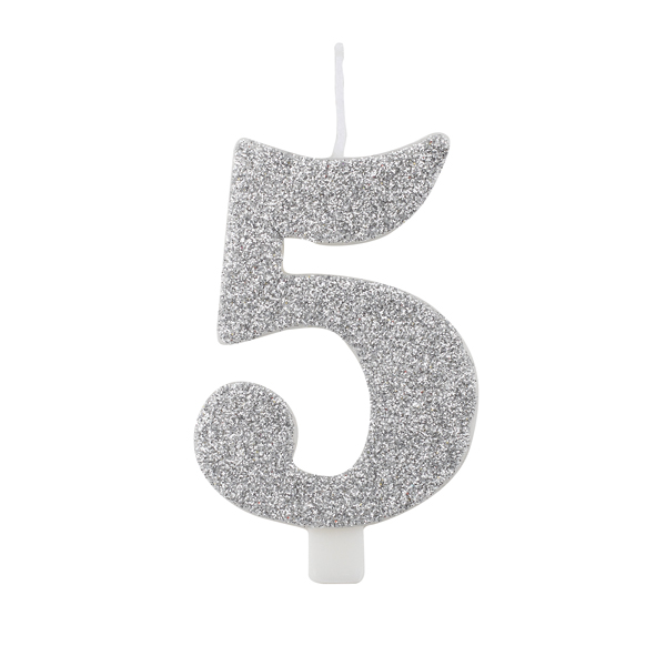 Svíčka číslo 5 stříbrná s glitrem Svíčka číslo 5 stříbrná s glitrem