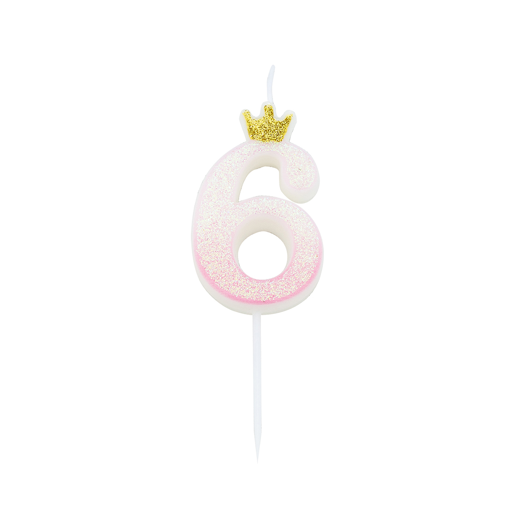 Svíčka číslo 6 růžová s korunkou a glitrem 9,5 cm
