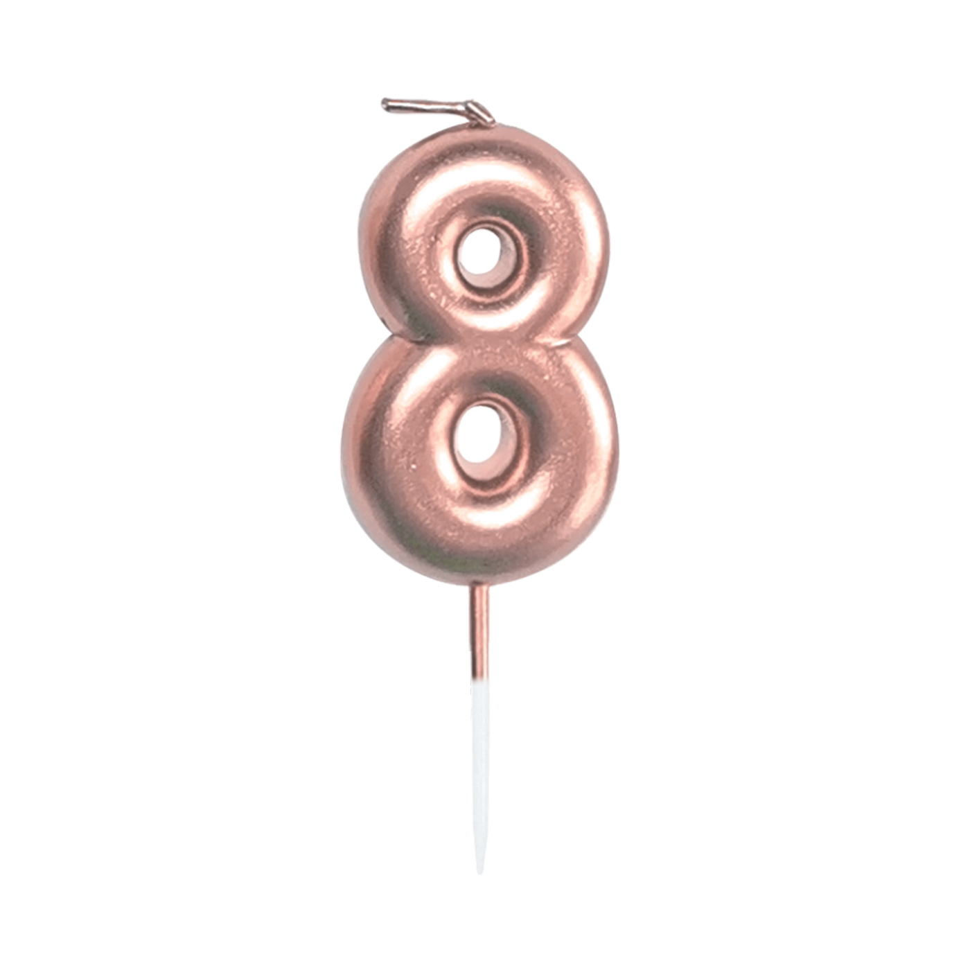 Dortová svíčka ve tvaru číslice v elegantní rose gold barvě. Výška svíčky: výška čísla 5 cm (celková výška včetně tyčinky 8 cm) Obsah balení: 1 ks svíčky na plastové tyčce