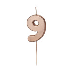 Rose gold dortová svíčka ve tvaru číslice. Výška svíčky: výška čísla 4,5 cm (celková výška včetně špejle 9 cm) Obsah balení: 1 ks svíčky na dřevěné tyčce