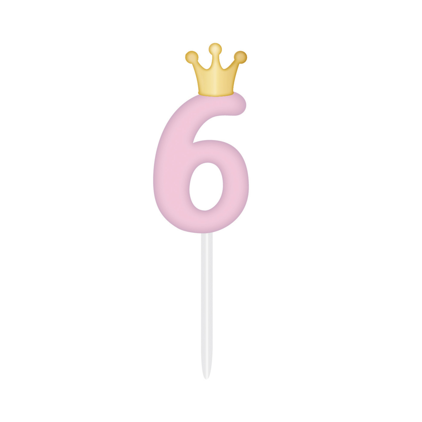 Originální dortová svíčka ve tvaru světle růžové číslice 6 se zlatou korunkou stylově dozdobí dort na dětskou narozeninovou oslavu či párty. Výška svíčky: 6 cm (10,5 cm včetně plastového zápichu) Obsah balení: 1 ks růžové svíčky s korunkou