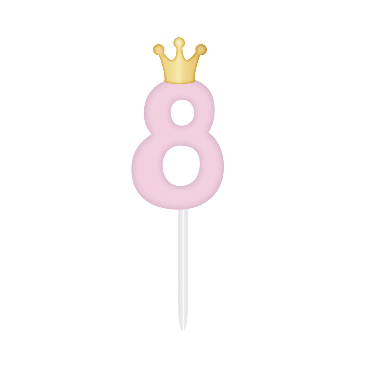 Originální dortová svíčka ve tvaru světle růžové číslice 8 se zlatou korunkou stylově dozdobí dort na dětskou narozeninovou oslavu či párty. Výška svíčky: 6 cm (10,5 cm včetně plastového zápichu) Obsah balení: 1 ks růžové svíčky s korunkou
