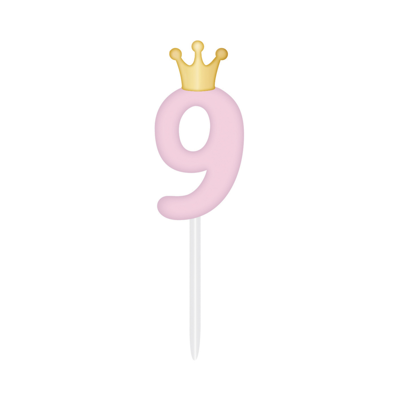 Originální dortová svíčka ve tvaru světle růžové číslice 9 se zlatou korunkou stylově dozdobí dort na dětskou narozeninovou oslavu či párty. Výška svíčky: 6 cm (10,5 cm včetně plastového zápichu) Obsah balení: 1 ks růžové svíčky s korunkou
