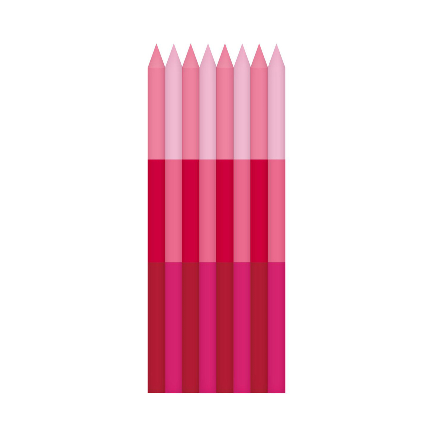 Sada dortových svíček v růžovém provedení se třemi pruhy v několika odstínech je ideální jako veselá ozdoba narozeninového dortu. Výška svíčky: 10 cm Obsah balení: 24 ks svíček