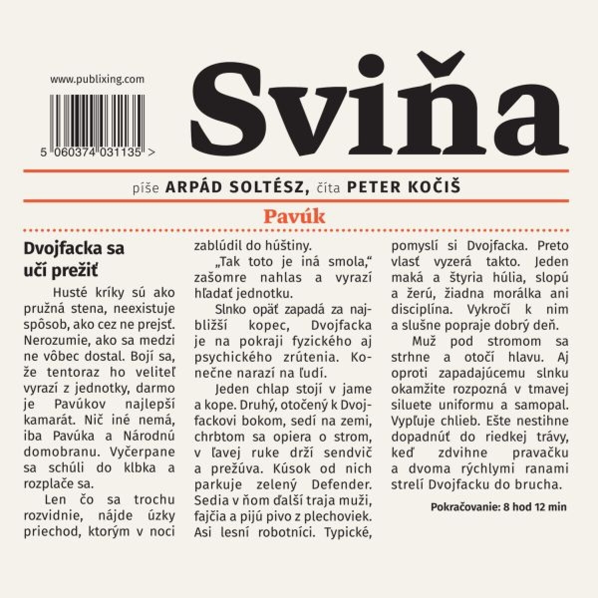 Audiokniha: Obyvatelia Malebnej krajinky pod Drobnými veľhorami sporadicky miznú. Iní urobia – celkom nečakane – závratné kariéry. Tie dva javy spolu súvisia. Zlo rozožiera krajinu všetkým na očiach, celkom otvorene. Obete sa nebránia, pravdu si nepripúšťajú: to by si predsa mocní nedovolili, ľudia by to predsa nedopustili a im by sa to predsa nemohlo stať. Nakoniec sa to, samozrejme, všetkým stane. Závislá tínedžerka zmizne z resocializačného centra, no nikomu nechýba. Rozhodne nikomu, kto by sa počítal. Feťáčky klamú, kradnú a zomierajú. Každý to vie. Talentovaný politik sa stane Predsedom a ovládne celú krajinu. Neovláda však svoje pudy a napokon ani vlastné rozhodnutia. Nie je to problém, kým ho nútia robiť veci, ktoré sa mu páčia. Malý vekslák sa chce stať veľkým hráčom. Ľudia sú preňho len šachové figúrky, ktoré posúva po štvorčekovanom papieri. Neuvedomuje si, že nehrá šach, iba piškvorky. O zabijakovi mafie koluje fáma, že za svoj život vykopal jamu, do ktorej by sa pohodlne zmestila podzemná garáž nákupného centra. Nie je to pravda, jamu si každý vykope sám. Kto má v rukách lopatu, mal by rátať s najhorším. Nadšený neonacista stratí v lese kamaráta. Nájde životnú lásku, dobrého priateľa, prácu snov a nakoniec aj pravdu, ktorá ho o všetko znova oberie. Mladý analytik sa stane vychádzajúcou hviezdou novinárskeho neba. Čaká ho skvelá budúcnosť, ak dokáže prežiť. Príbehy jednotlivých postáv vykresľujú systém, v ktorom neexistujú hranice medzi mafiou a politikou ani zločinom a zákonom. Život je bezcenný, smrť je tovar. Štát ovládajú nízke pudy vysokopostavených zločincov. Autor bestsellera Mäso – Vtedy na východe vo svojom druhom románe Sviňa predkladá čitateľovi desivú fikciu, ktorá by sa poľahky mohla stať slovenskou realitou.