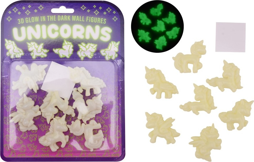 Svítící jednorožci na zeď 3D – 7 ks 3D jednorožců, které lze pomocí oboustranné lepenky přilepit na zeď nebo jakýkoliv jiný povrch.