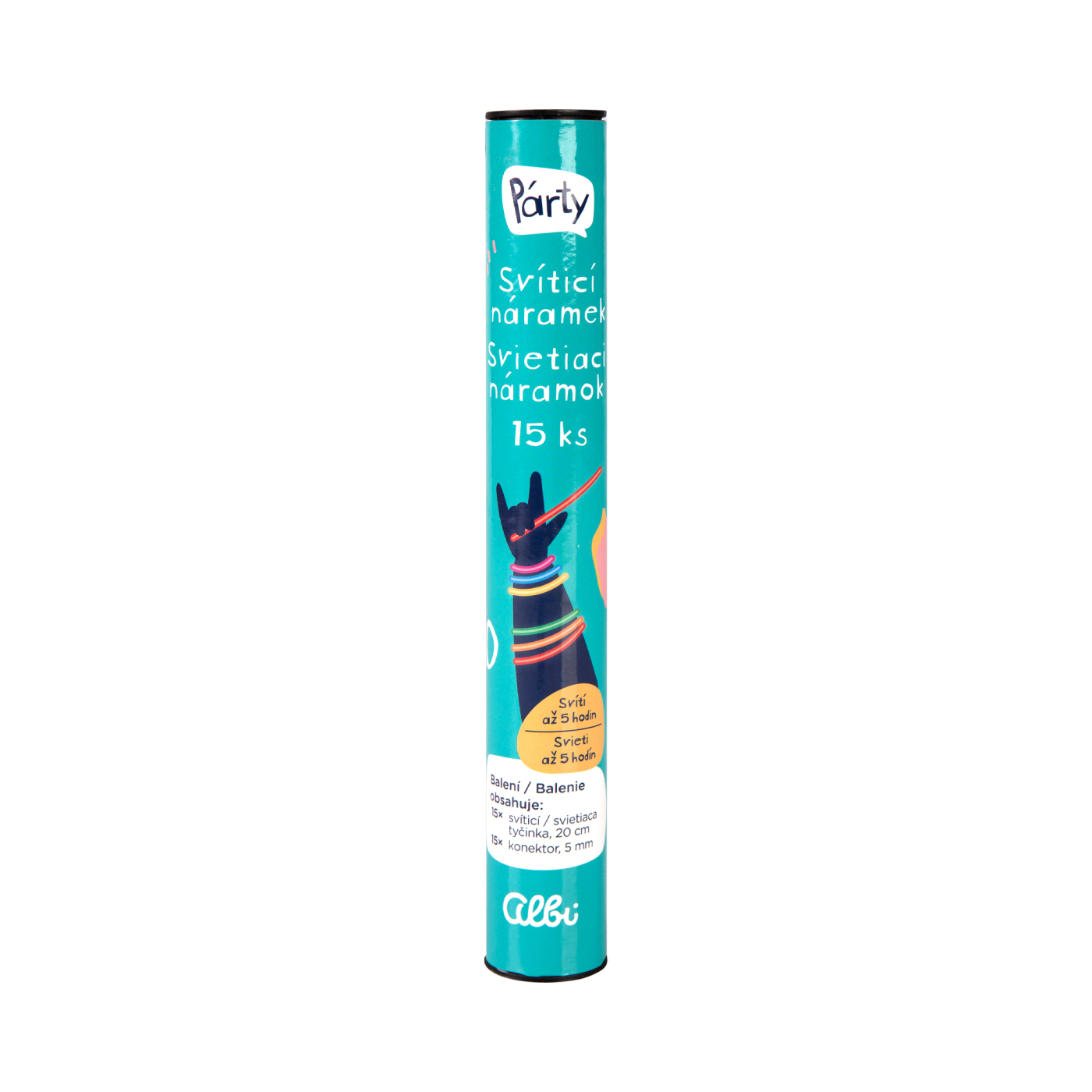 Sada 15 kusů svítících náramků v mixu barev, se kterou rozzáříte každou párty! Svíticí tyčinky vydrží svítit až 5 hodin! Balení obsahuje: 15 × svítící tyčinka (20 cm) a 15 × konektor (5 mm) Použití: Tyčinku ohýbejte, lámejte a třeste s ní. Může trvat několik okamžiků, než dosáhne plného jasu. Upozornění: Uchovávejte svíticí tyčinku v původním obalu, dokud nebude připravena k použití. Vnitřní tyčinka obsahuje sklo. Neprořezávejte ani nepropichujte povrch svíticí tyčinky. Chemické látky ve výrobku jsou nehořlavé, ale mohou trvale znečistit nábytek, oblečení a koberce. Po použití svíticí tyčinku zlikvidujte v souladu se zákonem o odpadech. Nenechávejte svíticí tyčinky na přímém slunci ani je nevystavujte vysokým teplotám. Při zasažení kůže nebo očí důkladně vypláchněte vodou. Složky nezpůsobí poranění očí, ale mohou způsobit dočasné potíže. Nepijte tekutinu ani ji nevkládejte do úst! Vhodné pro děti od 5 let. Doporučuje se dohled dospělé osoby.