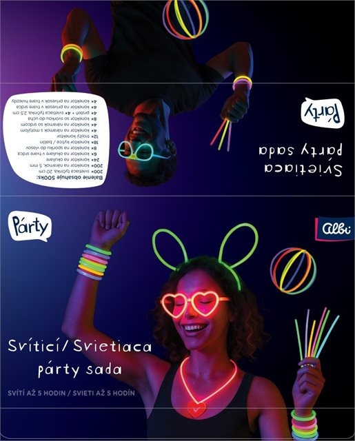 Velká sada 500 kusů svítících párty doplňků, se kterou rozzáříte každou párty! Svítící tyčinky v mixu barev a tvarů skvěle vyniknou ve tmě. Sada umožňuje sestavit náramky, brýle, čelenky, sponky, prsteny, náušnice, náhrdelníky a dokonce i balóny. Perfektní volba pro venkovní i domácí večerní aktivity. Po aktivaci vydrží tyčinky svítit až 5 hodin! Balení obsahuje 500 ks: 200× svítící tyčinka (20 cm), 200× konektor na náramek (5 mm), 24× konektor na brýle, 6× konektor na brýle ve tvaru srdce, 8× konektor na sponku do vlasů, 18× konektor kytice/balón, 12× trojitý konektor, 4× konektor na náramek s motýlem, 4× konektor na náramek se srdcem, 8× konektor se svorkou do ucha, 4× prsten + 4× svítící tyčinka, 2,5 cm, 4× konektor na přívěsek ve tvaru srdce a 4× konektor na přívěsek ve tvaru hvězdy Použití: Tyčinku ohýbejte, lámejte a třeste s ní. Může trvat několik okamžiků, než dosáhne plného jasu. Upozornění: Uchovávejte svítící tyčinku v původním obalu, dokud nebude připravena k použití. Vnitřní tyčinka obsahuje sklo. Neprořezávejte ani nepropichujte povrch svítící tyčinky. Chemické látky ve výrobku jsou nehořlavé, ale mohou trvale znečistit nábytek, oblečení a koberce. Po použití svítící tyčinku zlikvidujte v souladu se zákonem o odpadech. Nenechávejte svítící tyčinky na přímém slunci ani je nevystavujte vysokým teplotám. Při zasažení kůže nebo očí důkladně vypláchněte vodou. Složky nezpůsobí poranění očí, ale mohou způsobit dočasné potíže. Nepijte tekutinu ani ji nevkládejte do úst! Vhodné pro děti od 5 let. Doporučuje se dohled dospělé osoby.