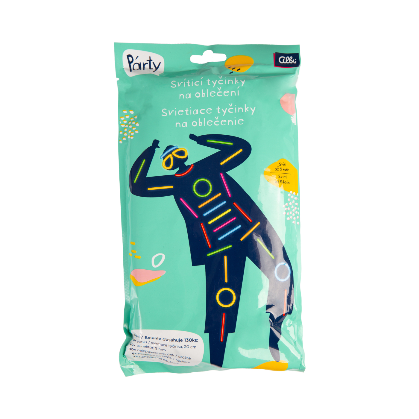 Sada svítících tyčinek na oblečení v univerzálním provedení se kterou rozzáříte každou párty! Balení obsahuje tyčinky, které po aktivaci svítí ve tmě, konektory a nalepovací proužky. Svítící tyčinky vydrží svítit až 5 hodin! Balení obsahuje: 40× svítící tyčinka (20 cm), 40× konektor, 40× nalepovací proužek, 6× konektor na brýle a 4× konektor na náušnice Použití: Tyčinku ohýbejte, lámejte a třeste s ní. Může trvat několik okamžiků, než dosáhne plného jasu. Upozornění: Uchovávejte svítící tyčinku v původním obalu, dokud nebude připravena k použití. Vnitřní tyčinka obsahuje sklo. Neprořezávejte ani nepropichujte povrch svítící tyčinky. Chemické látky ve výrobku jsou nehořlavé, ale mohou trvale znečistit nábytek, oblečení a koberce. Po použití svítící tyčinku zlikvidujte v souladu se zákonem o odpadech. Nenechávejte svítící tyčinky na přímém slunci ani je nevystavujte vysokým teplotám. Při zasažení kůže nebo očí důkladně vypláchněte vodou. Složky nezpůsobí poranění očí, ale mohou způsobit dočasné potíže. Nepijte tekutinu ani ji nevkládejte do úst! Vhodné pro děti od 5 let. Doporučuje se dohled dospělé osoby.