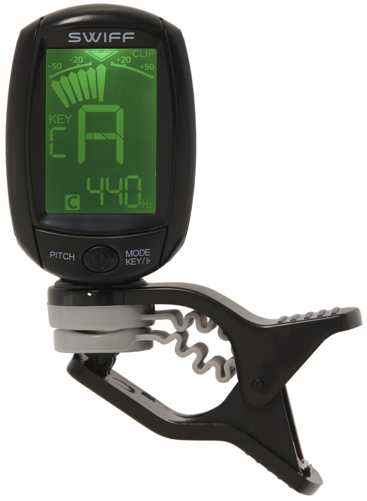 Klipová ladička Swiff A3 je klipová ladička s přehledným displejem, která kromě standardního ladění pomocí vibrací nástroje umožňuje také ladění přes mikrofon. Disponuje pěti režimy – kromě klasického chromatického nabízí režimy k ladění kytary, ukulele, baskytary a houslí. Naladí tóny v rozsahu A0-C8 a má nastavitelnou frekvenci 410-490 Hz. Umožňuje změnit také tóninu. Napájení pomocí baterie CR2032. Výhodou klipových ladiček je, že reagují na vibrace z nástroje a díky tomu jsou přesnější
