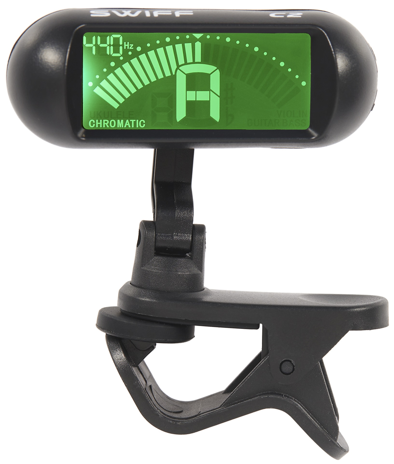 Klipová ladička Swiff C2 je klipová ladička s přehledným širokým displejem a flexibilním kloubovým mechanismem, který vám umožní natočit displej do libovolného směru. Disponuje pěti režimy – kromě klasického chromatického nabízí režimy k ladění kytary, ukulele, baskytary a houslí. Naladí tóny v rozsahu A0-C8 a poskytuje nastavitelnou frekvenci ladění 410-490 Hz. Napájení pomocí baterie CR2032. Výhodou klipových ladiček je, že reagují na vibrace z nástroje a díky tomu jsou přesnější a umožňu