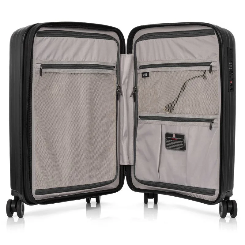 Vlastnosti: Kufr ECHO je ideální volbou pro ty, kteří plánují krátkou cestu. Jeho atraktivní design a funkčnost jsou vlastnosti, které jistě osloví milovníky cestování. Je vyroben z polypropylenu, díky čemuž je trvanlivý a odolný proti poškození. Materiál je houževnatý a pružný, po tvrdém nárazu se vždy vrátí do původního tvaru. Rozměry kufru umožňují, aby se s ním dalo volně pohybovat po letišti a aby mohl být uložen pod sedadlem nebo v horní přihrádce letadla. Je vybaven čtyřmi otočnými kolečky, která usnadňují pohyb s ním po různých typech povrchů, jako jsou chodníky nebo schody. Tato kolečka jsou vyrobena z plastu, který zajišťuje vysokou trvanlivost a odolnost proti oděru. Při cestování s modelem ECHO si můžete být jisti naprostou bezpečností převáženého obsahu, protože je celý zabezpečen kombinovaným zámkem TSA. Díky němu mohou kufr otevřít a zavřít také celníci, aniž by došlo k jejich invazi. Uvnitř se nacházejí dvě přehledné přihrádky s kapsami na zip a elastickými popruhy, které zajišťují bezpečnost obsahu. Přihrádky jsou vyloženy elegantní podšívkou. Další vlastností modelu ECHO je, že kufr lze prodloužit přibližně o 3 cm. Pouzdro je vybaveno portem USB pro připojení mobilních zařízení k powerbance. Materiál: polypropylen Barva: černá Hmotnost: 2,5 kg Výška: 55 cm Šířka: 39 cm Hloubka: 22 - 25 cm Objem: 42 - 49 l