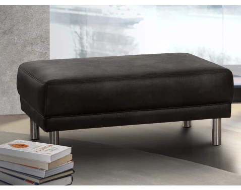 Elegantní taburet na chromově lesklých nohách nabízí příjemně měkký komfort sezení. Očalouněn černou látkou s vintage optikou lesklé broušené kůže.