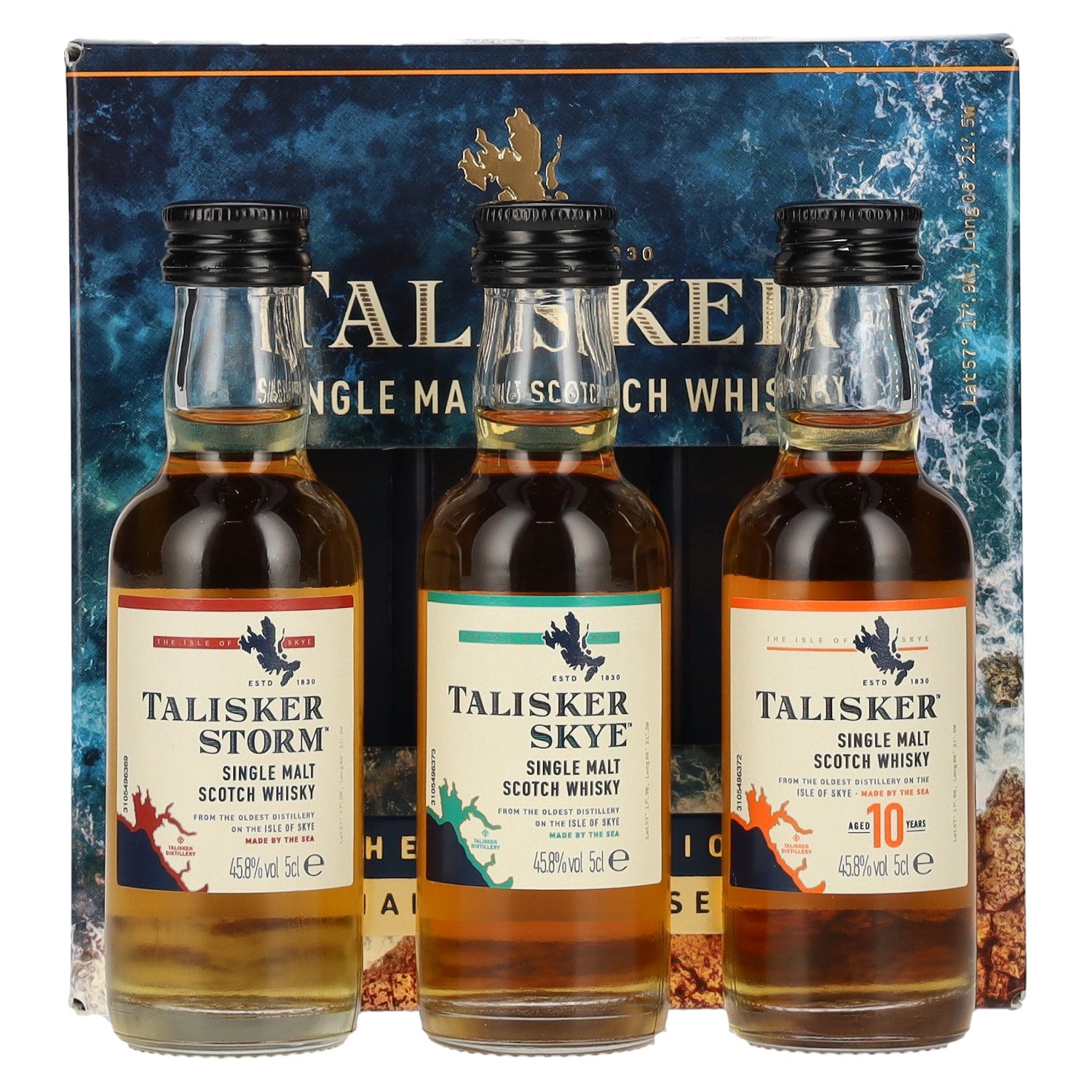 Tato sada obsahuje tři vynikající jednosladové whisky Talisker, které představují sortiment palírny: - Talisker 10yo 45,8% - Klasika Talisker, známá svou kouřovou a slanou chutí v kombinaci s lehkou sladkostí a teplým závěrem. - Talisker Storm 45,8% - Intenzivní whisky se silným rašelinovým aroma, která zaujme elegantní směsí koření a slaných mořských tónů. - Talisker Skye 45,8% - Jemnější Talisker, který se vyznačuje svěžími citrusovými tóny a lehce rašelinovou a nádherně vyváženou vůní.