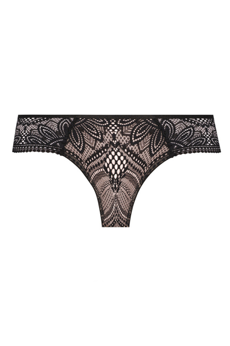 Dámská tanga - prolamovaná krajka - síťovaná přední část - průstřih ve tvaru V na zadní straně - plochý elastický pas Složení: 80% polyamid, 15% elastan, 5% bavlna