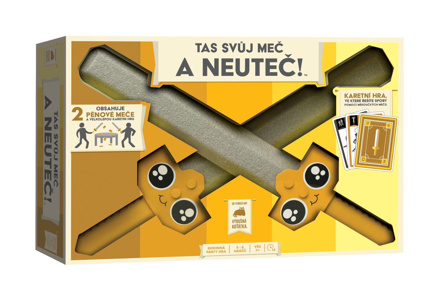 <p>Velkolepá šermířská karetní hra, ve které řešíte spory pomocí měkoučkých mečů.</p> <p>Představujeme vám úplně první karetní hru od tvůrců Výbušných koťátek a Bum Bum Burrita se šermířským soubojem pomocí mečů, ve které se hráči hádají o karty a tyto hádky řeší údery pěnovými meči... přesně tak jako dospělí. Jak na hru? Je to naprosto jednoduché! Snažte se sesbírat 3 shodné karty. Pokud se stane, že potřebujete stejnou kartu, jako jiný hráč, musíte o ní bojovat! Chcete-li hrát, vezměte si určitý počet karet a umístěte je na hromádky doprostřed stolu. Všichni se podívejte na karty na stole a rozhodněte se, která hromádka vám pomůže dokončit vaši sadu karet. Jakmile se rozhodnete, kterou hromádku chcete, napočítejte do 3 a všichni současně na hromádky karet ukažte. Pokud jste jediní, kdo ukázal na hromádku, získáváte všechny karty z této hromádky do vaší sady. Pokud však ukážete na hromádku karet, kterou chce i někdo jiný, budete o ní muset soupeřit pomocí mečů. Musíte se přitom řídit pravidly (někdy hodně hustými), která jsou popsána na hromádce karet, o kterou bojujete. Pokračujte ve hraní, dokud jeden z hráčů nebude mít před sebou 3 sady stejných karet. Ten pak vyhrává hru. </p> <p>Tuto hru můžete stoprocentně hrát s dětmi (kteří si to obzvlášť budou užívat) i dospělými (v jakékoli fázi dne i večera). Věk ani výška nejsou důležité. Nezáleží, jestli to umíte, nebo neumíte s mečem. Záleží pouze na tom, jestli rádi mlátíte lidi falešnými meči. </p> <p>OBSAH BALENÍ:</p> <p>• 2 měkké meče</p> <p>• 2 křížové kolíky</p> <p>• 72 karet</p> <p>• 1 česká pravidla</p>