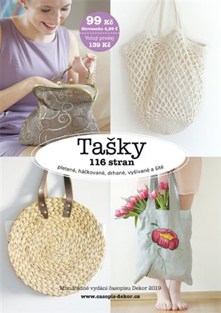 Speciální vydání časopisu Dekor, které na 116 stranách nabízí více jak 50 tipů na tašky, drobné kosmetické taštičky, vaky, batůžky nebo kabelky. V době, kdy recyklujeme a nahrazujeme plastové tašky je toto vydání skvělým pomocníkem pro všechny, kdo rádi tvoří. A jaké techniky ve speciálu najdete? Můžete s námi tašky háčkovat, plést, šít, drhat, vyrábět z ratanu, vyšívat, sešívat z provázků nebo šít z plsti. Najdete zde i tolik oblíbenou síťovku, kterou si můžete buď uháčkovat nebo vyrobit technikou macramé. Vše popisujeme krok za krokem a v zadní části speciálu najdete i pracovní popisy, jak na výrobu. Po prolistování zjistíte, že už bez ručně vyráběné tašky nechcete být. Pusťte se do práce, ať máte svůj vlastní originál!