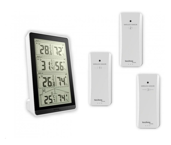 LCD displej o rozměrech 62 x 110 mm, velikost číslic na displeji – vnitřní teplota a relativní vlhkost 12 mm, vnější teplota a relativní vlhkost 15 mm, měření vnitřní teploty a relativní vlhkosti, měření vnější teploty a relativní vlhkosti 3 bezdrátovými čidly, zobrazení všech naměřených hodnot na displeji najednou, alarm horní a dolní nastavitelné meze vnější teploty