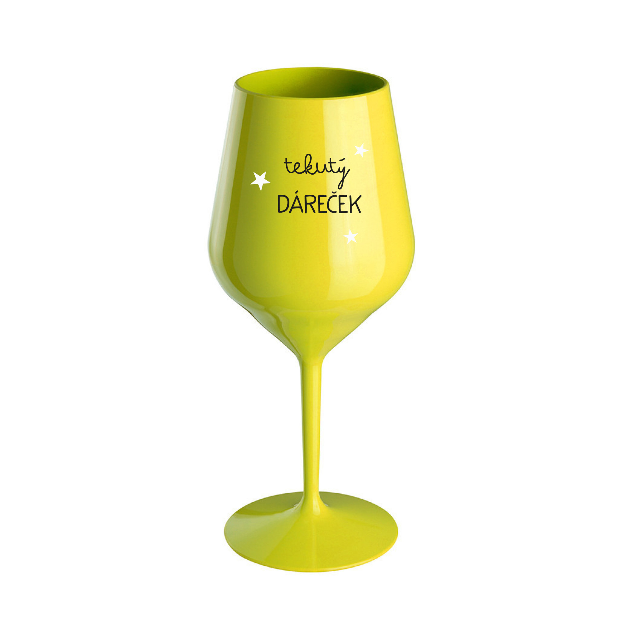 Nerozbitná žlutá vinná sklenice s motivem TEKUTÝ DÁREČEK je skvělá na zahradu, pláž, výlet, piknik a parádu udělá i při kempování. Jelikož je vyrobená z kvalitního polykarbonátu je de facto nerozbitná. Je to luxusní kousek, s nímž si víno můžete vychutnat prostě kdekoliv. Mají ergonomický tvar, který příjemně padne do ruky a protože je lehká, usnadňuje to její přenášení. Je snadno skladovatelná a lehce se čistí. Díky svému designu si s ní můžete vychutnat doopravdy kdekoliv bezproblémové pití výborného vína. Materiál PP. Vyrobené s láskou v ČR