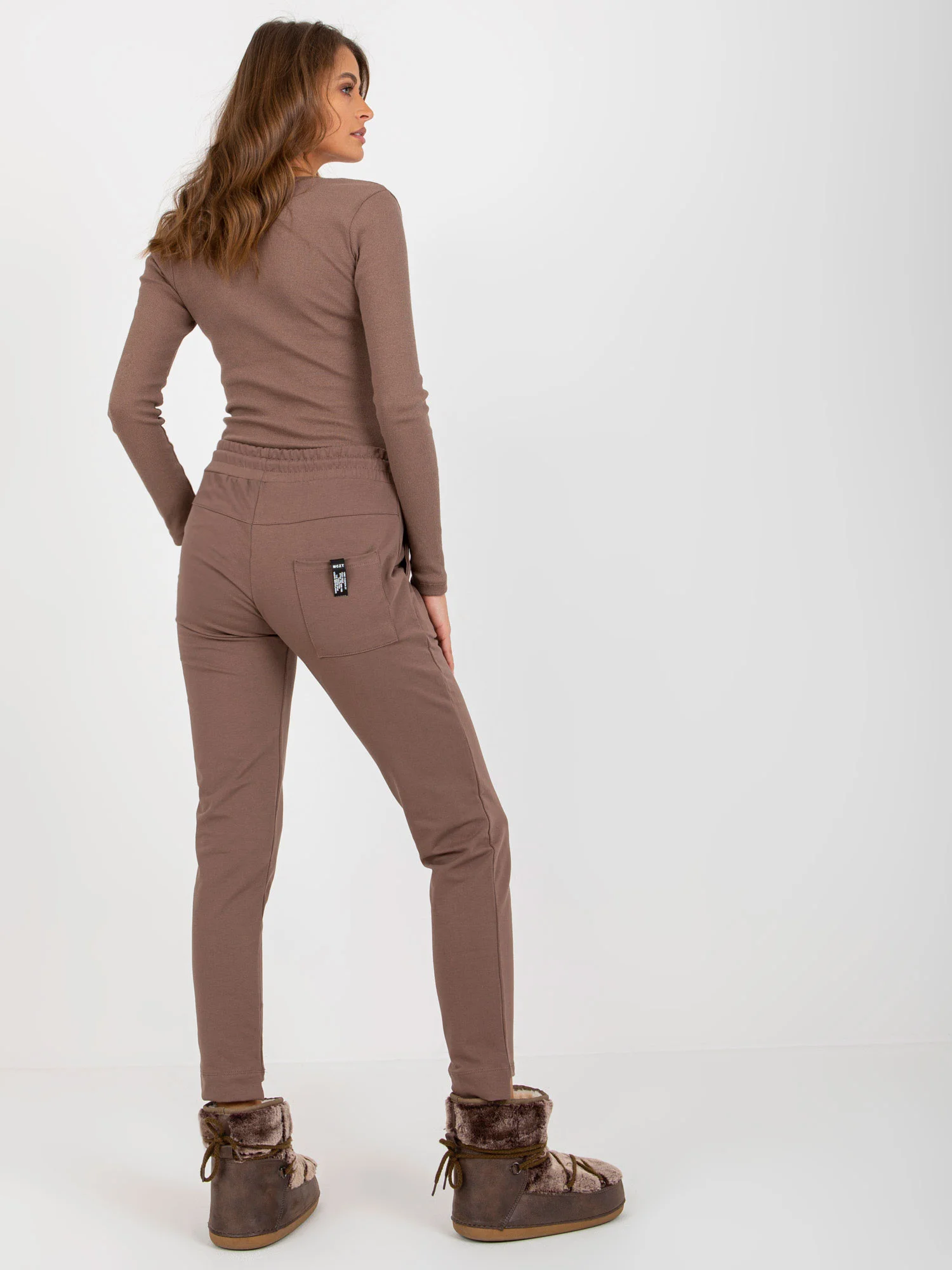 Hnědé tepláky basic s kravatou . Kód produktu: RV-DR-8380.25P dominantní vzor: hladký styl: ležérní příležitost: každý den, do města, na procházku Modelka má na sobě velikost S/M. Rozměry modelky: výška 175 cm, prsa 84 cm, pas 65 cm, boky 92 cm. Rozměry kalhot ve velikosti S/M měřené na plocho: šířka v pase - 36 cm, výška v pase - 28 cm, celková délka - 96 cm. Mezinárodní velikostVýškaObvod pasuObvod bokůVnější délka nohaviceDélka vnitřní nohaviceS/M36/38160-17272-8690-9487-9074-75L/XL40/42164-17884-96102-10694-9876-77