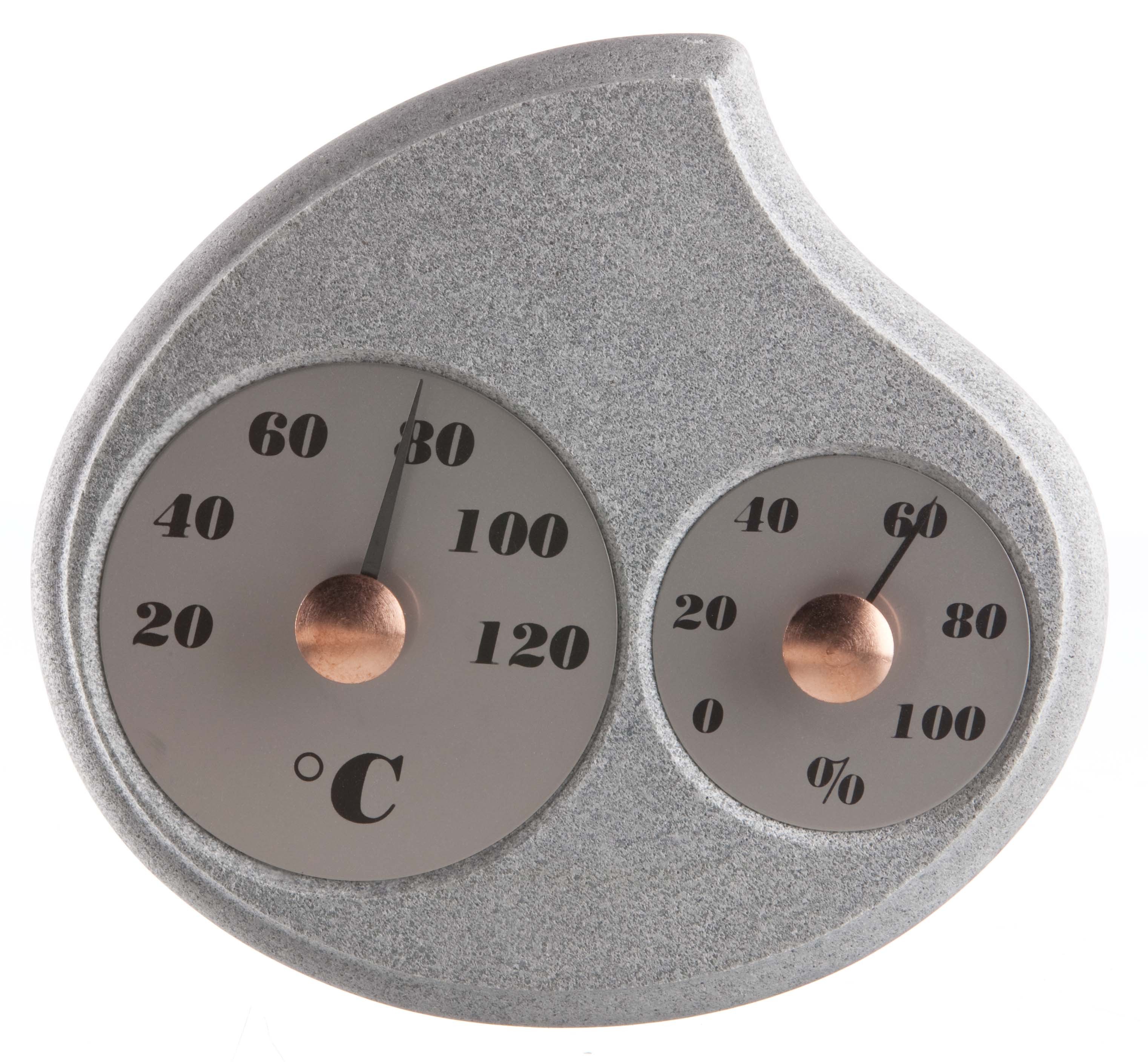Saunový teploměr s vlhkoměrem, vytesaný z mýdlového kamene (mastkový kámen - na dotyk je pocitově jako mýdlo, anglicky "soapstone"). Mastkový kámen disponuje ohromnou akumulační schopností a díky své měkkosti lze opracovat do nádherných tvarů. Originální finský výrobek. Hmotnost 1,04 kg.