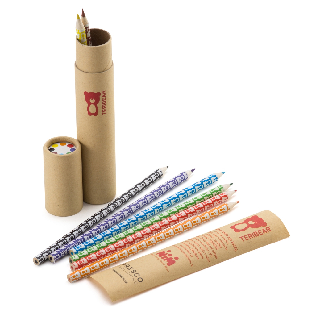 Sada 8 kusů ořezaných pastelek s potiskem medvídka TERIBEAR v papírovém tubusu. Sada obsahuje červenou, modrou, zelenou, žlutou, oranžovou, fialovou, hnědou a černou pastelku.