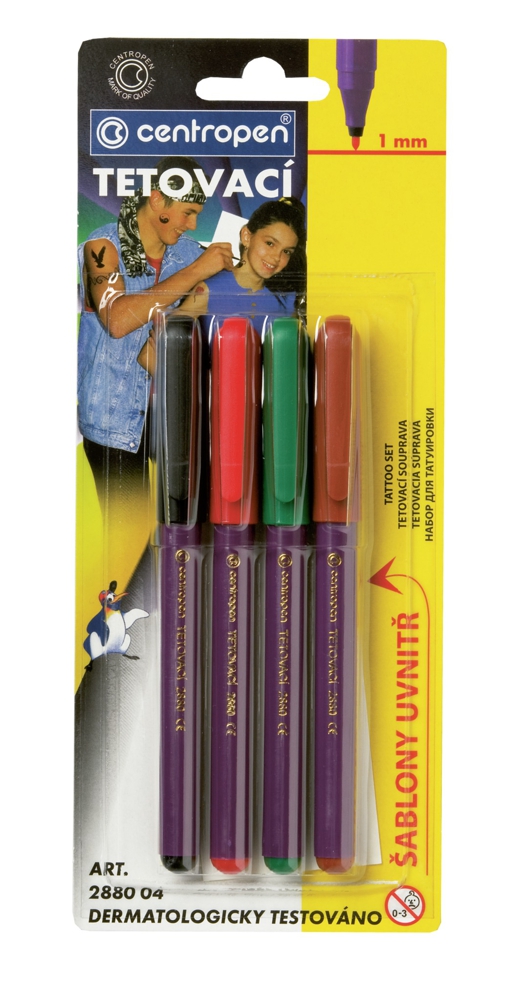 Tetovací fix 4 ks + šablony. Popisovač na kůži, dermatologicky testovaný inkoust. Z kůže smývatelný mýdlem a vodou. Samolépicí šablony s 16 motivy. Tetování vydrží až 60 hodin. Válcový hrot, šířka stopy 1 mm.