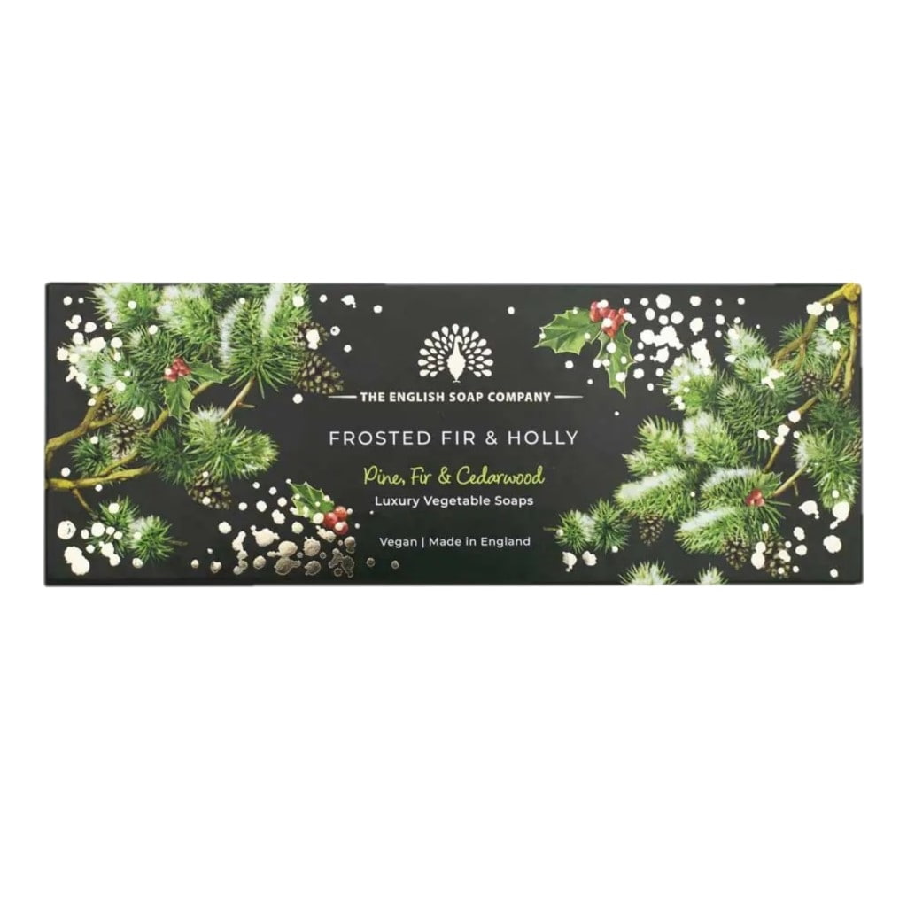 The English Soap Company Dárková sada mýdel Frosted Fir and Holly – 3 x 100 g, zelená barva, papír. Přírodní tuhá mýdla na ruce od britské značky The English Soap Company, budou pečovat o vaše ruce a jejich nádherná vůně provoní celou koupelnu.