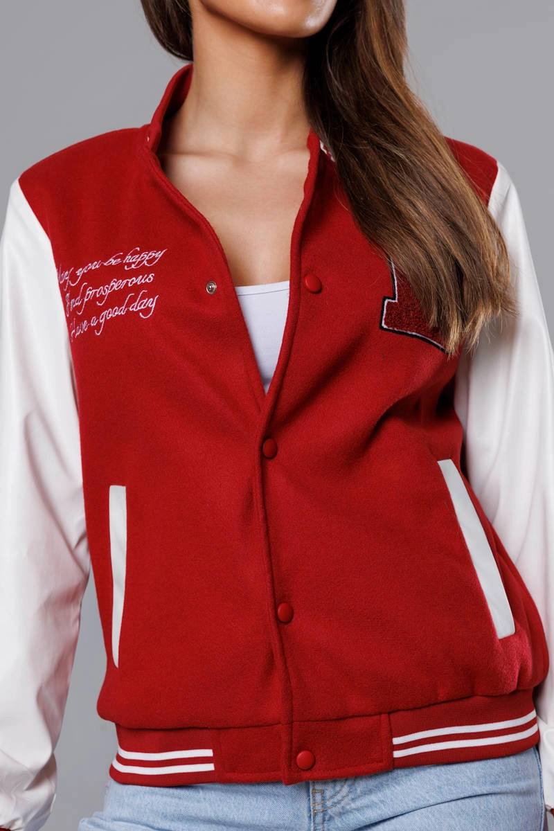 Věnujte prosím pozornost při výběru velikosti dle velikostní tabulky uvedené níže. Velikosti neodpovídají běžně nošené konfekci. Tenká bunda typu college Bunda má volný střih, podšívku, zapíná se patentkami a má dvě kapsy se zapínáním na patentky. Rukávy jsou ušité z eko kůže. Model má délku k bokům. Složení: 100 % polyester.